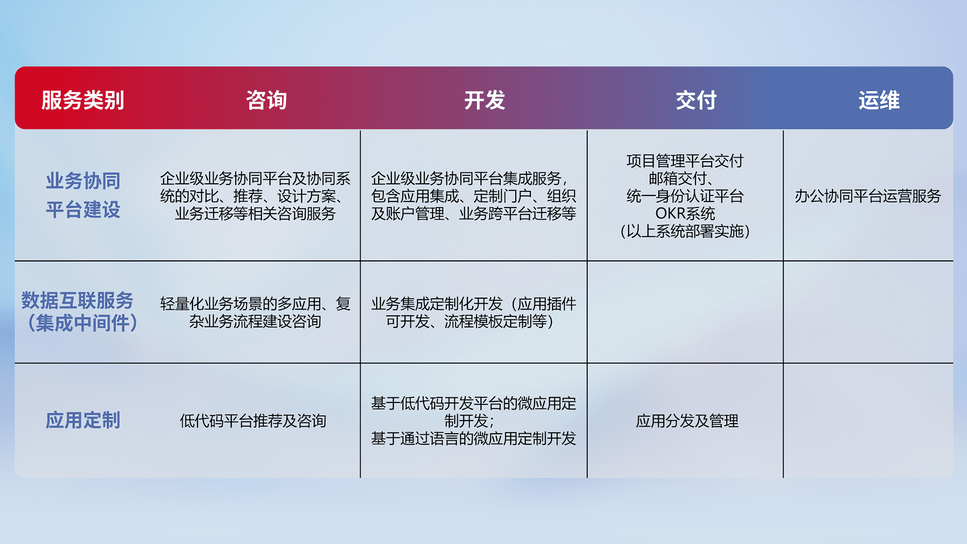 针对钉钉、、、企微、、、IDaas等平台级产品提供产品的规划、、、方案、、交付、、、定制化开发等服务,,,实现如统一协同办公、、、、智能客户服务、、、、混合会议管理、、、智能数据查询、、、、等业务场景,,,实现数字化转型。。。